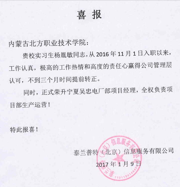 近日,我院赴泰兰普特信息服务有限公司实习生传来捷报。汽修专业杨胤敏同学在实习期间凭借自身扎实的专业技术、务实的工作态度,表现突出,提前转正,同时正式荣升宁夏吴忠电厂部项目经理,全权负责项目部生产运营。