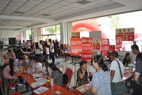 在迎新大厅中,负责迎新的师生正有序地开展着工作,有的在为新生办理入学手续,耐心细致的讲解注意事项,有的在进行编班、编宿舍、有的办理着新生的交费…..每个服务台前都能看到热情的笑脸,体会到周全的服务。本次迎新工作还有一道靓丽的风景线,就是身着“爱心”图案的学生志愿者,从学生一下车,到走进校门,全程进行服务,接站、搬运行李,帮助学弟学妹们尽快熟悉学校环境,适应大学生活。
