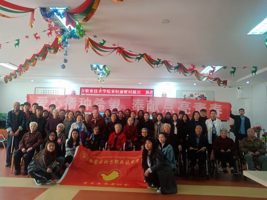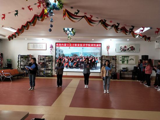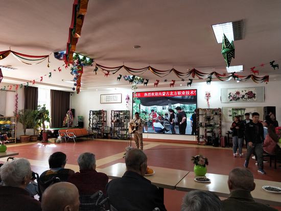 同学们为老人们进行着精彩的节目表演,一首《甜蜜蜜》勾起了老人们脑海中的记忆,跟着音乐轻哼起来。当乐器社的同学用葫芦丝演奏了一首《友谊地久天长》,使整个安养院飘荡着悠扬的曲声,祝愿老人们的友谊也地久天长。爷爷奶奶们也受到了同学们的感染,相继唱起了歌曲《打靶归来》,京剧《许三观卖血记》等节目,使气氛达到了高潮。