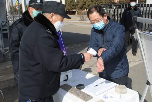 学院领导在校门口,值班同志和门卫按要求对几位院处领导进行了登记和测试。测试后乔子荣院长向值班人员、安保人员详细了解了疫情防控工作,他着重强调学院大门值班登记工作人员要严格核实进入人员的身份信息和去向,尤其要核查外来人员的身份证和来访事宜,特别是对校门出入信息登记、二维码扫描入校、体温测量等情况要严格把关。