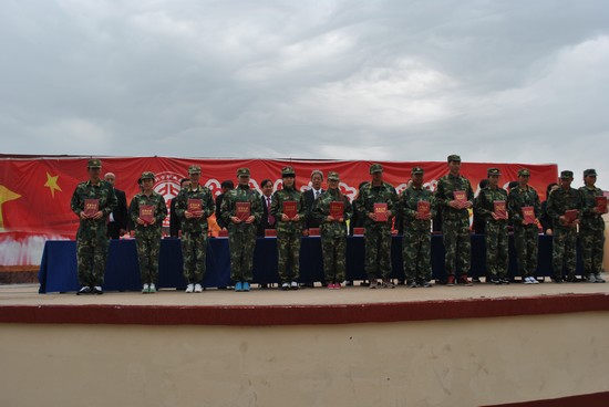 队列表演结束后,学校领导为获得军训“优秀学员”的个人颁奖。