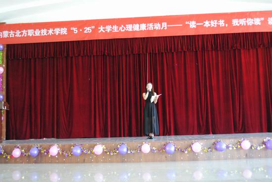 5月25日,我院在大礼堂隆重举办了“5.25大学生心理健康活动——读一本好书,我听你读”展示会,出席活动的有内蒙古心理咨询师冬青、李秀英老师、团委孙蕾老师、学生处副处长任铁映老师。经过初部选拔,15名佼佼者从参赛者中脱颖而出,他们在文字中放飞想象,在朗诵中感悟人生。