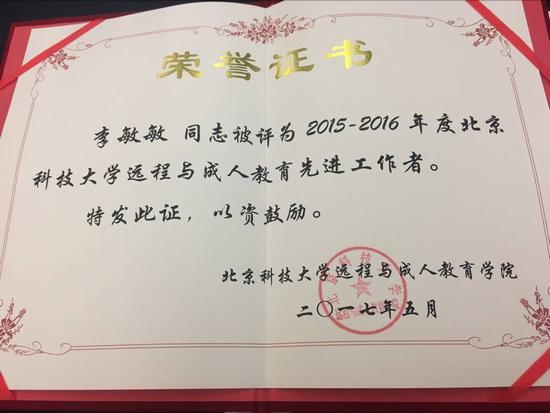 5月19日至20日,北京科技大学远程与成人教育学院在南京召开年度工作会议。会上,我院继续教育学院荣获北京科技大学优秀函授站称号,李敏敏老师被授予先进工作者荣誉称号。