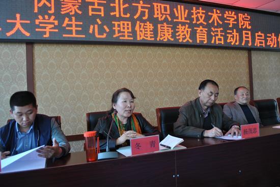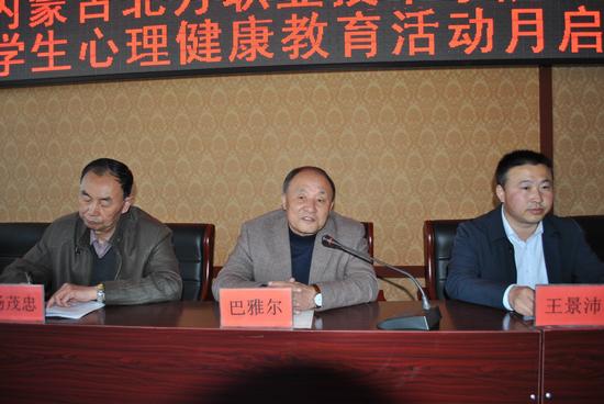 4月27日,我院2017年大学生心理健康活动月启动仪式在学术报告厅举行。党委常务副书记巴雅尔、党委副书记兼纪委书记杨茂忠、副院长王景沛、内蒙古心理协会心理咨询师冬青老师、李秀英老师、学生处处长孙永、副处长任铁映出席活动。活动由王院长主持。
