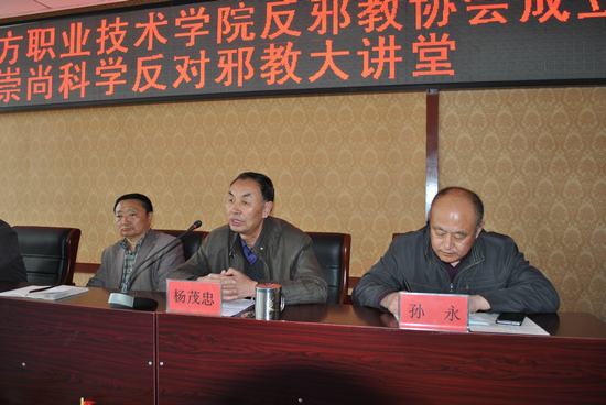 接着由杨茂忠书记作题为《崇尚科学反对邪教》的报告,杨书记从宗教与邪教的区别、邪教组织的基本特征和共同特点、邪教常用的骗人手法、迷信和宗教信仰的区别、哪些邪教活动应以犯罪论处等方面,进行了详细阐述。他强调,反对邪教应该倡导“学科学、爱科学、用科学”,运用科学解决现实生活中的各种问题。并对学生提出几点提高自我防范能力的建议:一是加强科普知识的学习,自觉抵御迷信、伪科学和反科学的侵袭;二是增强法制观念,自觉做遵纪守法的好学生;三是要智慧地抵制邪教,对邪教的歪理邪说做到不听、不看、不信、不传,拒绝网上邪教宣传。